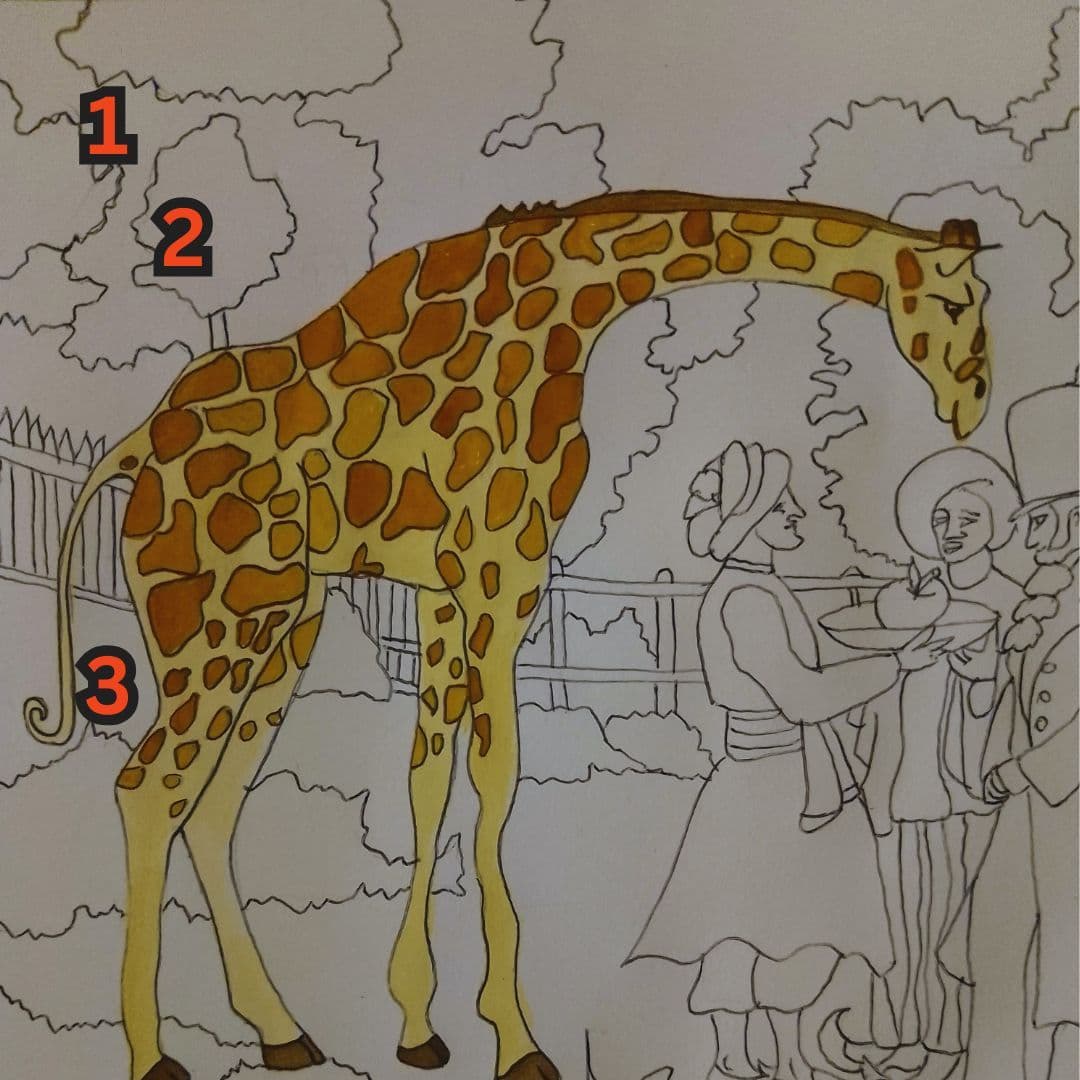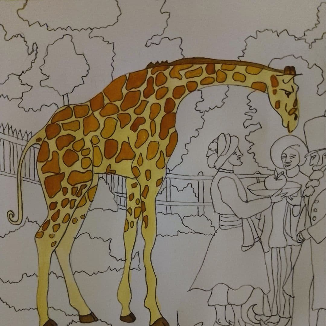 Bu cümleyi zürafanın eğlenceli kıvrık kuyruğuna bağladım. Bu kıvrımın içinde Mona Lisa’nın konfetiler patlattığını, balonlar uçurduğunu, yılbaşı pastası kestiğini, her yıl bu kutlamayı yapmak için buraya geldiğini hayal ettim.