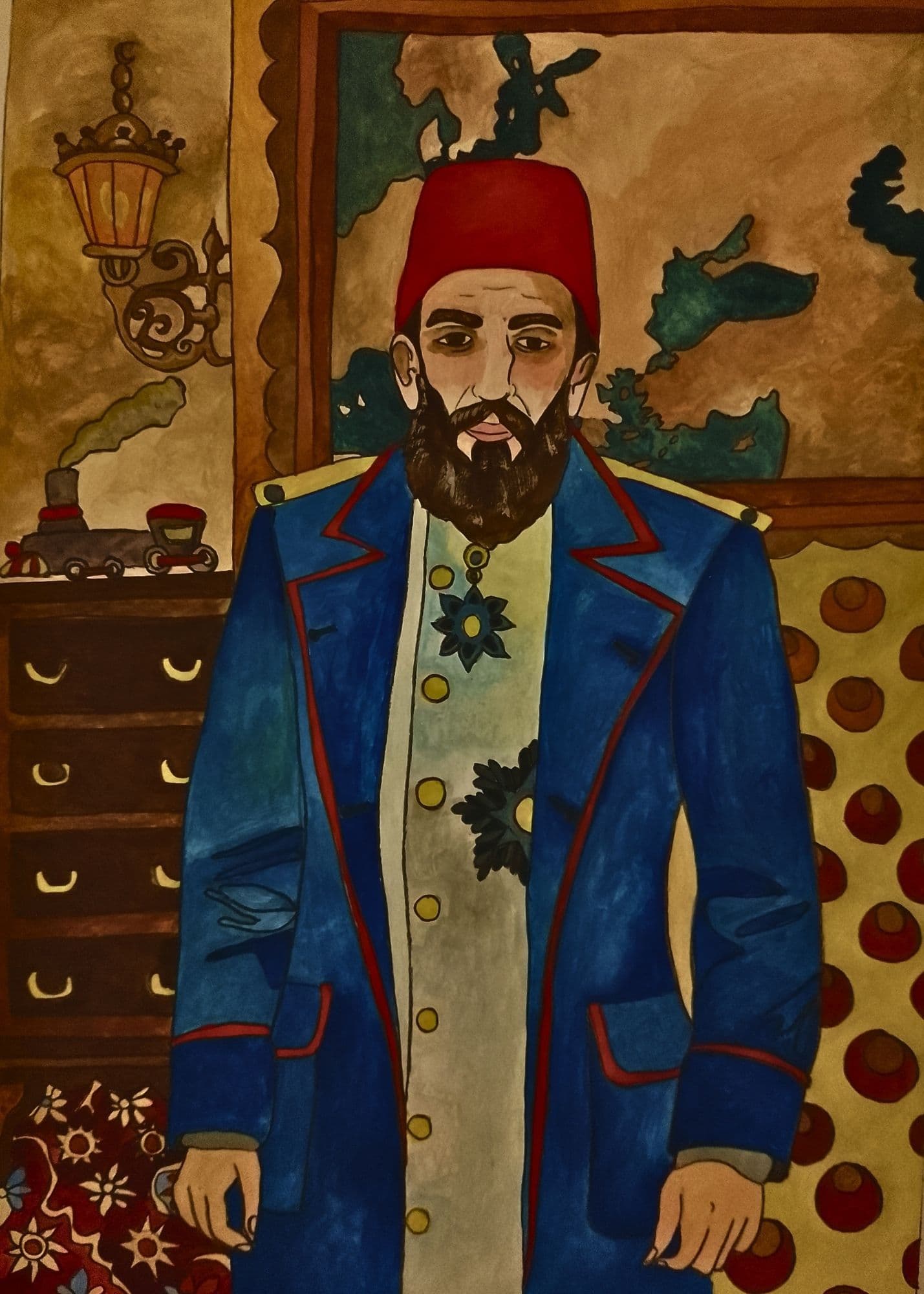 I think I was able to explain my general thought even with the first example. I will continue in this way. My English learning process continues. If you have read my previous articles, I had also written that I use some of the illustrations I draw as a memory palace. I decided to do this detailed work on my own. The part I will share publicly will continue like this. That is, I will examine and explain the historical subject on an illustration. I will talk about how the 3 basic needs can be guaranteed, and thus I will ensure that the law of "love your neighbor as yourself" is engraved in our memories with every single event. In this example, you see the illustration I was inspired by the Abdulhamid II painting of the Italian painter named Fausto Zonaro, who served the Ottoman palace for 14 years. When Abdulhamid II was dethroned in 1909, Zonaro also lost all his titles and privileges in an instant.